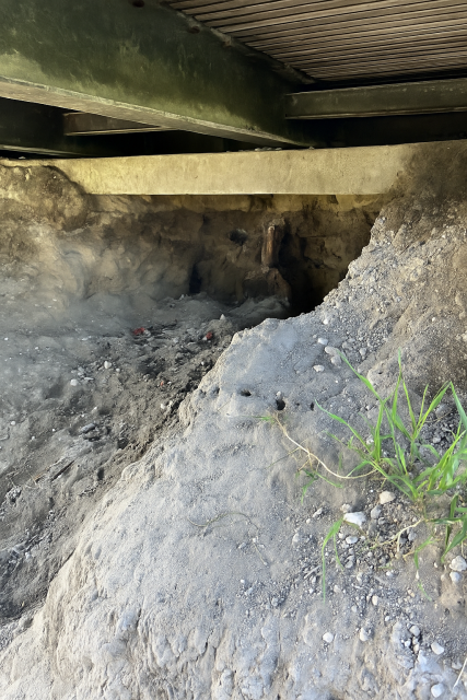 Onder de brug is veel fundatiezand weggegraven. Waarschijnlijk hebben kinderen onder de brug een hut of schuilplaats gebouwd. We moedigen buitenspelen en creativiteit van kinderen van harte aan. Het is dan ook aannemelijk dat dit niet bewust is gedaan. Helaas zorgt dit er wel voor dat stabiliteit van de brug vermindert, wat tot onveilige situaties kan leiden.